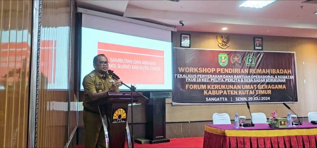 KUTIM – Wakil Bupati Kutai Timur (Kutim) Kasmidi Bulang menegaskan Forum Kerukunan Umat Beragama (FKUB) elemen penting dalam menjaga kerukunan umat beragama di Kutim. Hal itu diungkapkan Kasmidi Bulang saat Workshop mengenai pendirian rumah ibadah serta menyerahkan dana hibah kepada FKUB, Senin (29/7/2024).